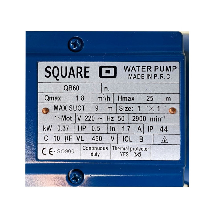 پمپ آب خانگی نیم اسب اسکواردی مدل QB60 از جمله پمپ های با درجه کیفی A ساخت چین می باشد. پمپ آب نیم اسب جهت تقویت فشار آب برای یک یا دو طبقه با متراژ پایین مناسب می باشد.