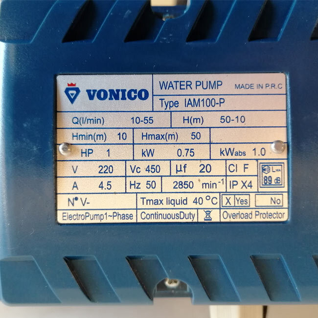 ویژگیهای فنی پمپ آب ونیکو IM100-P