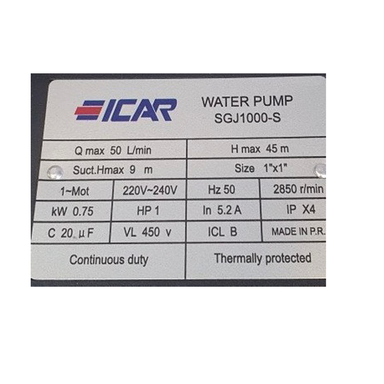 پمپ جتی کلهاستیل ایکار SGJ1000-S یک پمپ خودمکش (جتی) تکفاز با پروانهٔ استیل و توانِ نامیِ 1 اسب است. این مدل معمولاً برای افزایش فشار آب در واحدهای مسکونی، آبیاریهای کوچک و مصارف خانگی استفاده میشود. (مقادیر فنی اصلی در جدول مشخصات زیر نمایش داده شدهاند.)