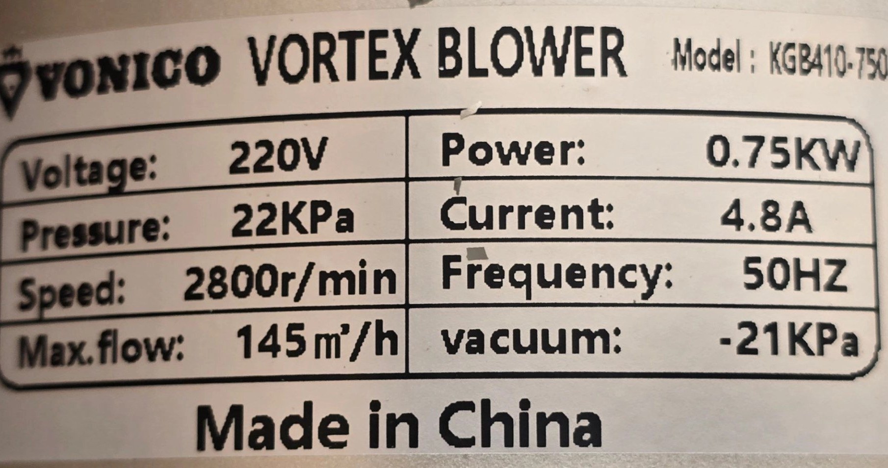 | توان موتور | 0.75 کیلووات (≈1 اسب) |