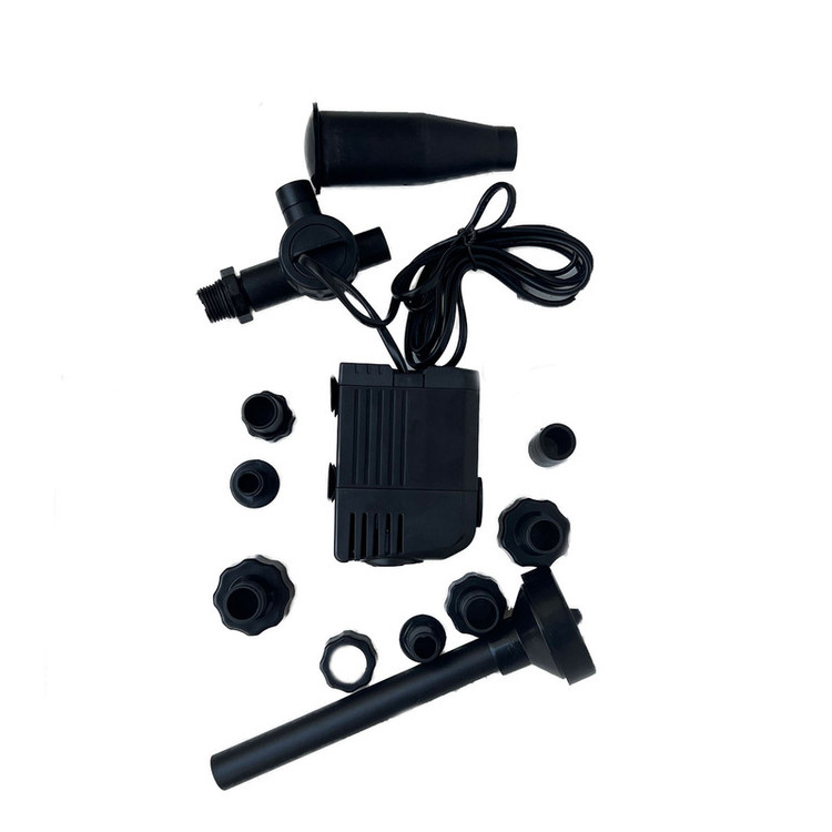 پمپ آبنما با قدرت ۳۰ وات دارای ۲ نازل فواره زیبا مدل چتری و مدل بارانی یا همان آبشاری دارای یک عدد سه راهی فلکه دار برای کاهش یا افزایش میزان فواره تولیدی دارای نازل برای نصب شلنگ جهت نظافت یا تخلیه آب حوض یا استخر